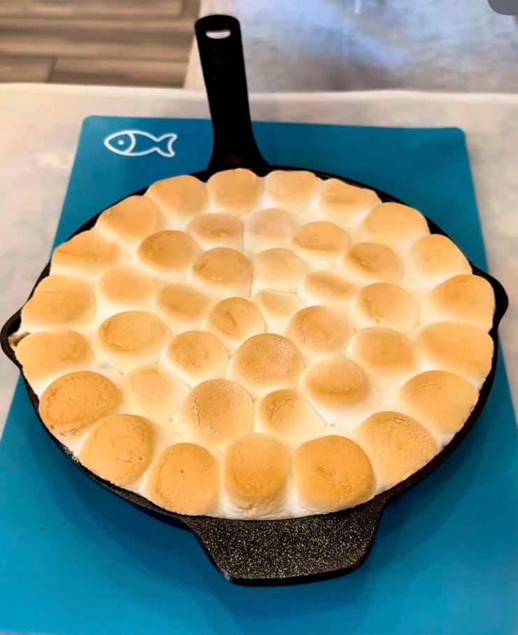 Place peanut butter in bottom of iron skillet, sprinkle with chocolate chips, cover with marshmallows and bake at 350* for 15 minutes, enjoy!